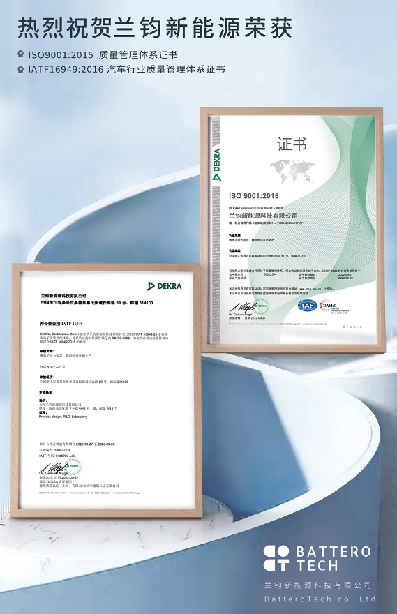 此前兰钧新能源上海基地已获得ISO9001和IATF16949证书,此次再获这两项证书表明兰钧新能源上海和嘉善公司在产品设计和制造上全面符合ISO9001:2015和IATF16949:2016质量管理体系的要求,标志着兰钧新能源电池获得了进入汽车市场领域的绿色通行证。这不仅证明了自身的实力,也是对公司未来成长壮大的一种鞭策。