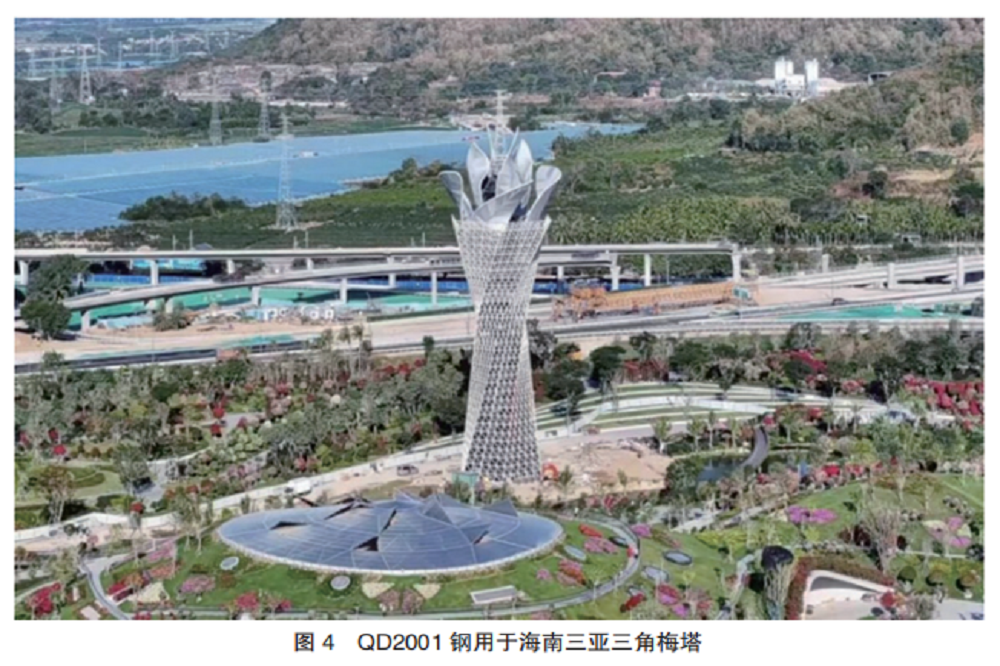 “先进高强不锈钢”是在国家“双碳”目标下,钢铁材料向“高强、高韧、轻量化、长寿命、高性价比”的重大战略研发方向。“先进高强不锈钢”在保证耐腐蚀性前提下,可以实现减量化使用,降低综合使用成本。目前已推广应用于高铁隧道工程、装配式建筑、地铁工程、集装箱、家电、能源和海洋工程等高端领域,实现了多个全球首次应用。QN1804和QD2001全球首次应用于装配式芯板建筑结构,助力远大可建公司建成了“F”办公楼和上水堂酒店公寓等项目,荣获世界高层建筑与都市人居学会(CTBUH)全球创新奖以及世界模块化建筑住宅类项目第一名(图3)。QD2001全球首次应用于地铁工程,实现了减碳轻量化。经中国钢结构协会专家评审认定“双相不锈钢QD2001在轨道交通辅助设施产品研发方面整体达到国际先进水平”。全球最大的集装箱航运企业之一马士基使用QN1803不锈钢用于生产冷藏箱内胆,实现了大幅度降本的目标。全球最大的干货箱制造企业中集集团使用QN1803和QD2001用于食品罐车,实现了30%减重和节能减排。全球最大家电企业之一的美的集团使用QN1803用于集成形性、焊接性和耐蚀性于一体的洗碗机等高端家电,实现了北美市场50多万台洗碗机的销售目标。此外,QN1906和QN2109等用于海边湿法脱硫塔的建造,QN2109耐海水腐蚀不锈钢应用于宁德三都澳海洋牧场。