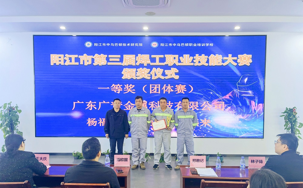 12月24日,由阳江市委人才工作领导小组办公室指导,阳江市中乌巴顿技术研究院承办的第三届焊工职业技能大赛颁奖仪式在阳江市中乌巴顿技术研究院举行。阳江滨海新区(阳江高新区)组织部副部长郑敢记、科技局局长潘欧醒,广东广青金属科技有限公司党委副书记、工会主席王大庆,以及相关部门负责人出席活动。大会表彰了7个团体和16名个人。广青科技荣获团体技能赛一等奖、优秀组织单位奖;参赛员工荣获“阳江市技术能手”称号以及个人技能赛一、二、三等奖。