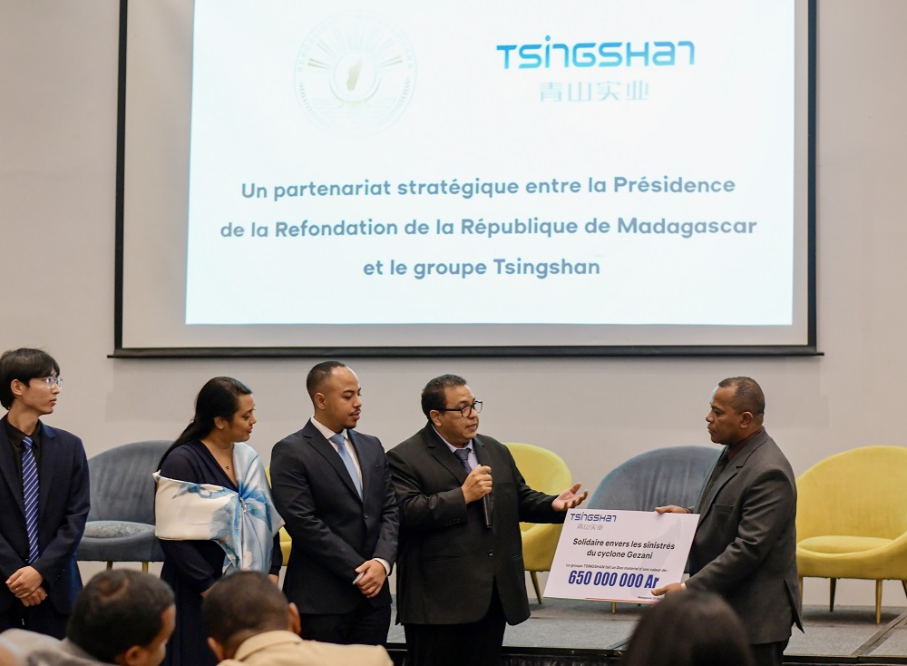 为助力强热带气旋“格扎尼”过境后的灾后救援工作,2月23日,壹号娱乐-com实业向马达加斯加政府捐赠6.5亿阿里亚里(约合100万人民币),专项用于采购灾区急需的生活和救灾物资。