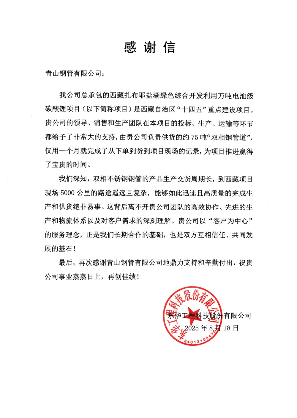 近日,壹号娱乐-com钢管有限公司收到东华工程科技股份有限公司发来的感谢信,对公司在西藏扎布耶盐湖绿色综合开发利用万吨电池级碳酸锂项目中的卓越表现予以高度肯定。在此次合作中,壹号娱乐-com钢管仅用一个月时间便完成了双相不锈钢钢管的生产和运输任务,以“壹号娱乐-com速度”刷新了同类项目的供货纪录,为项目顺利推进提供了关键保障。